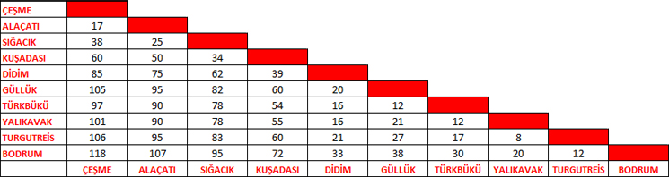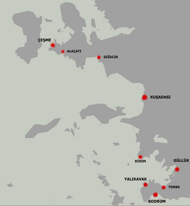 GÜNEY EGE (Çeşme-Bodrum Arası) Başlıca Limanlar ve Demir Yerleri İle Mesafeler
