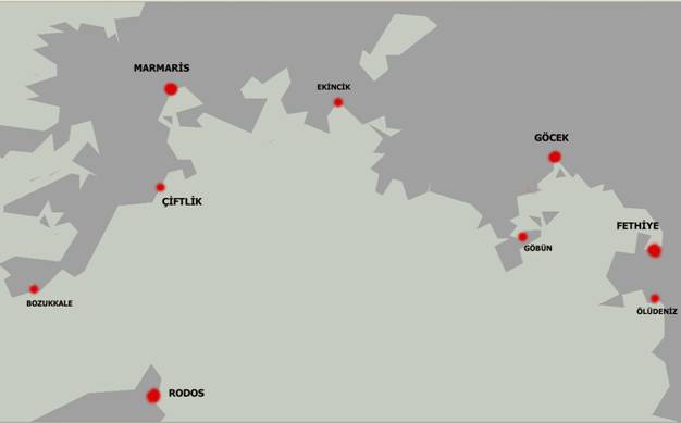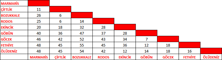 BATI AKDENİZ BÖLGESİ-I (Marmaris-Rodos-Fethiye Arası) Başlıca Limanlar ve Demir Yerleri İle Mesafeler